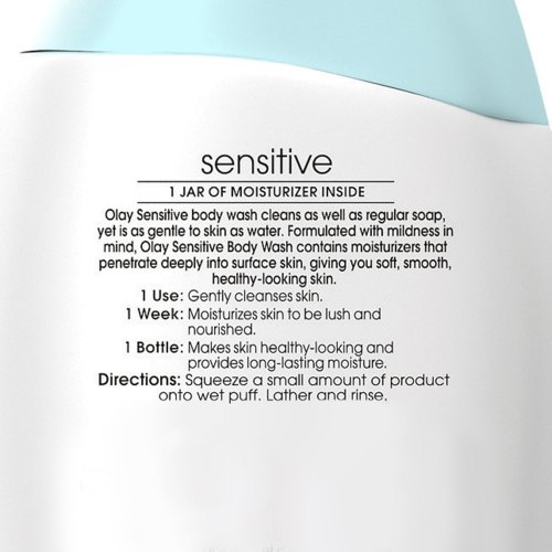 - Feature : Cleans as well as regular soap, yet is as gentle on skin as water / Goes beyond clean to improve the condition of skin over time / Moisturizers penetrate deeply into skin / Dermatologist-tested and formulated with mild in mind / Unscented, soap-free, and dye-free / Olay Sensitive Body Wash