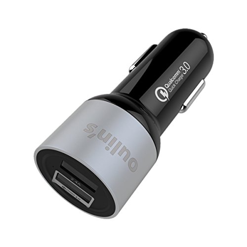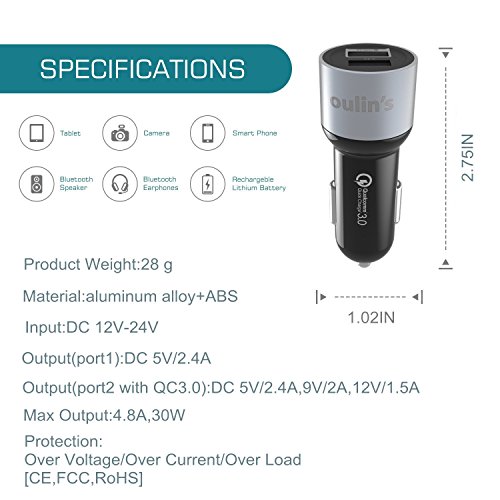 - oulin's Car Charger:Dual USB port design, QC3.0 + 5V / 2.4A charging port, 30W power output, the shell with aluminum alloy + ABS material,CNC manufacturing process, blue LED indicator allows you to easily find it in the night.