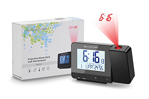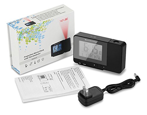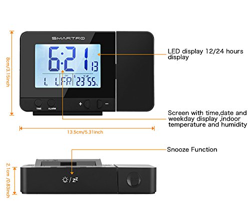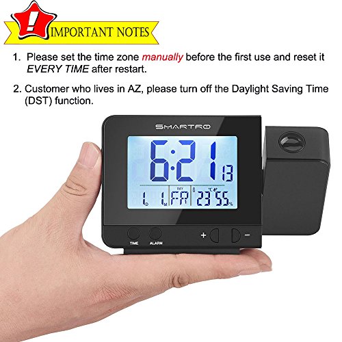 The Smartro projection clock is a compact and lightweight design which is packaged in a deluxe box that makes it a perfect gift choice or an ideal travel companion. Please read the instructions carefully before using it in order to learn how to change the temperature unit, how to set the time zone in US (not for Hawaii or Alaska), how to set the daylight saving time manually, and how to set the alarms, etc. Dual Alarms with Snooze Function: Set two separate alarms for different purposes. Press the top button if you want to sleep for extra five minutes. Press any button except the top button to stop the alarm, the alarm will automatically stay on for next day. The alarm will automatically shut off if left alone for 2 minutes. Project the time on the ceiling or wall: The projected time can be reversed 90 degrees making it easy to see. Time is projected in a clear soft red color but won't disturb you when you're sleeping. Two Choices for Watching the Time: If you would like time projection to be constantly on, then choose the provided power adapter.Simply pressing the snooze button to adjust the backlit's 4 brightness mode, light - medium - low - out. If you prefer the backlit LCD screen and time projection to be on for a few seconds, simply place two AAA batteries in the clock and press the top button. WWVB Radio-controlled Time Reception: Equipped with an atomic clock, time is automatically set via a radio controlled signal, Please set the time zone manually before the first use and?reset?it?EVERY?TIME?after?restart. The default time zone is Pacific time zone (-08). (Customer who lives in AZ, please turn off the Daylight Saving Time (DST) function.) During the RC reception mode, only the "-"button operates while the other buttons have no function. Press "WAVE"button to stop the RC reception mode. 0