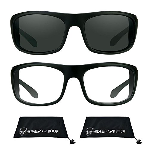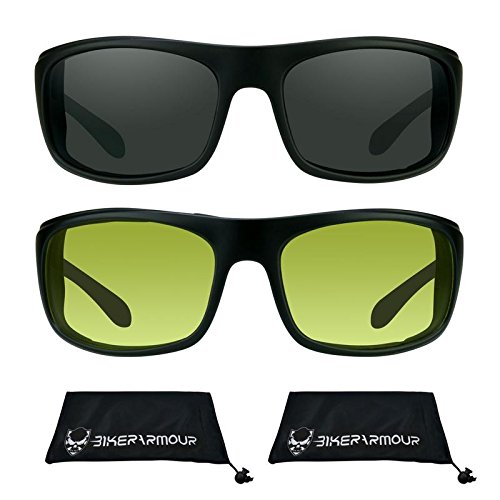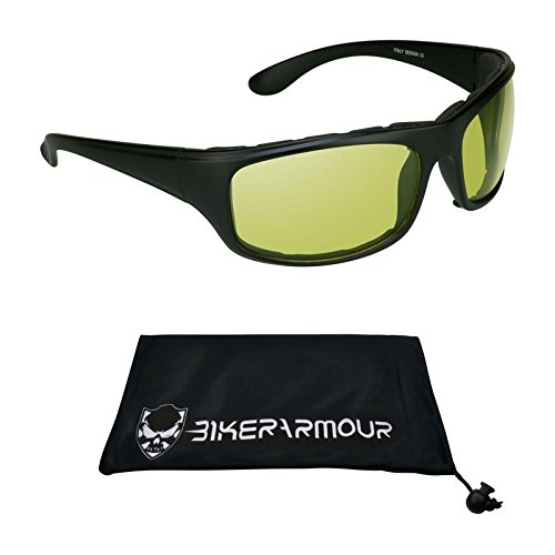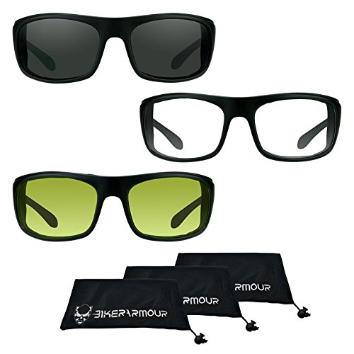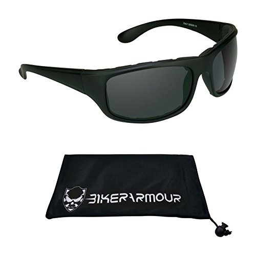 Studio : Bikershades Publisher : Bikershades Product Description Our latest addition to the BikerArmour Collection, the Spoiler motorcycle sunglass is the pinnacle of biker attitude and bad ass looks. With its rectangular design, the Spoiler protects your eyes from all angles. Available in clear lens, yellow lens and dark smoke. Fit Medium to most Extra Large head sizes. Temple Length: 120mm, Lens Height: 40mm, Lens Width: 65mm, Frame Width: 137mm, Bridge Width: 19mm 0