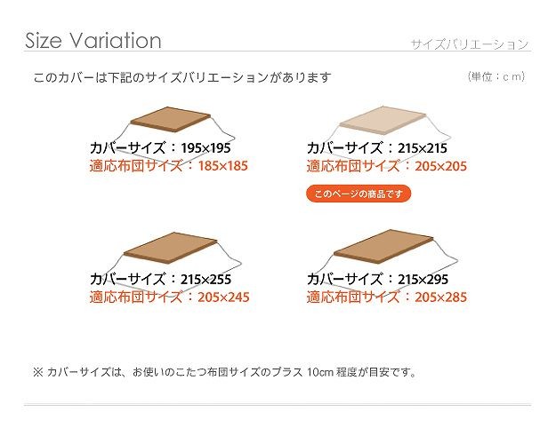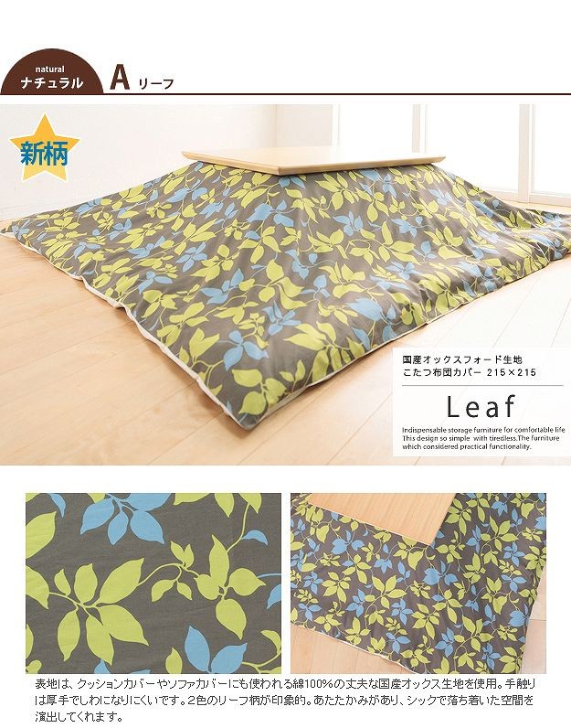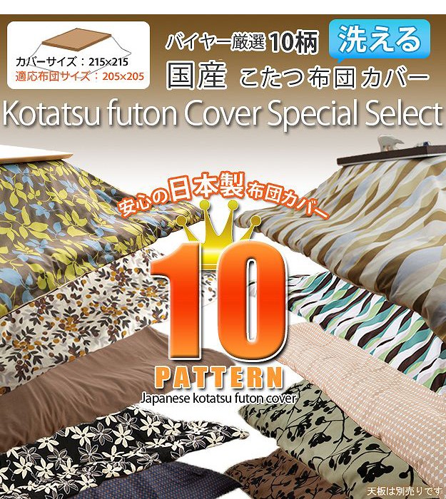 ※メーカー直送のため代金引換はお受けできません。※沖縄・一部離島は別途送料がかかります。お見積もりいたしますのでお問い合わせ下さい。商品について:しわがつきにくく丈夫なオックス生地を使用した日本製のこたつ布団カバー。10パターンのカバーをご用意してますので、お好みを選んで模様替えのアイテムに、こたつ布団のリフレッシュにどうぞ♪ファスナーはカバーの中央についており着脱しやすくなっています。洗濯機丸洗いOKでいつでも清潔にお使いいただけます。四隅に布団とカバーのズレ防止用の留め紐付きです。オススメこたつ布団サイズ(約):205x205cmサイズ(cm):215x215・約1.6kg材質:表地・裏地-綿100%完成品(21101136)