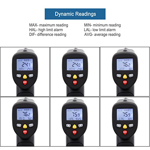 - MULTIFUNCTIONAL TOOL: Enable LOG function to store measurement up to 20 values; Thermometer with MAX/MIN/DIF/AVG/HAL/LAL temperatures reading track function and Very Fast Response Time: ≤150ms; The LCD screen is backlit, also has an Auto-Off function to extend the battery life, and features a low battery indicator so you never accidentally run out of juice (9V Battery included)