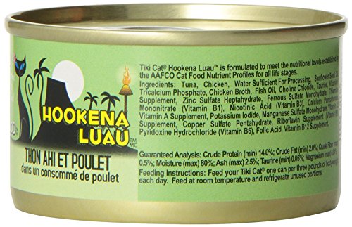 Tiki Cat Gourmet Whole Food Brand Cat Food Hookena Luau is shredded Ahi Tuna, chicken breast and egg prepared in consommé for a grain free, gravy free, zero carb meal. Complete and balanced diet for all life stages, feeding 2-percent of body weight per day to maintain weight. Typically feedings include one 2.8z can in the morning and evening per day or a 6.0z can split between 2-3 cats per day in the morning and evening. Great to feed solely or to supplement a dry food diet by adding the missing moisture and boosting the necessary protein and fat levels missing from kibble.