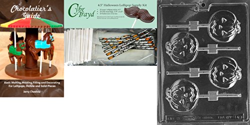 Cybrtrayd 00045StK25HBk-H049 "Medium Flat Pumpkin Lolly" Chocolate Mold with Chocolatier's Bundle, Includes 25 Lollipop Sticks and 25 Cello Bags