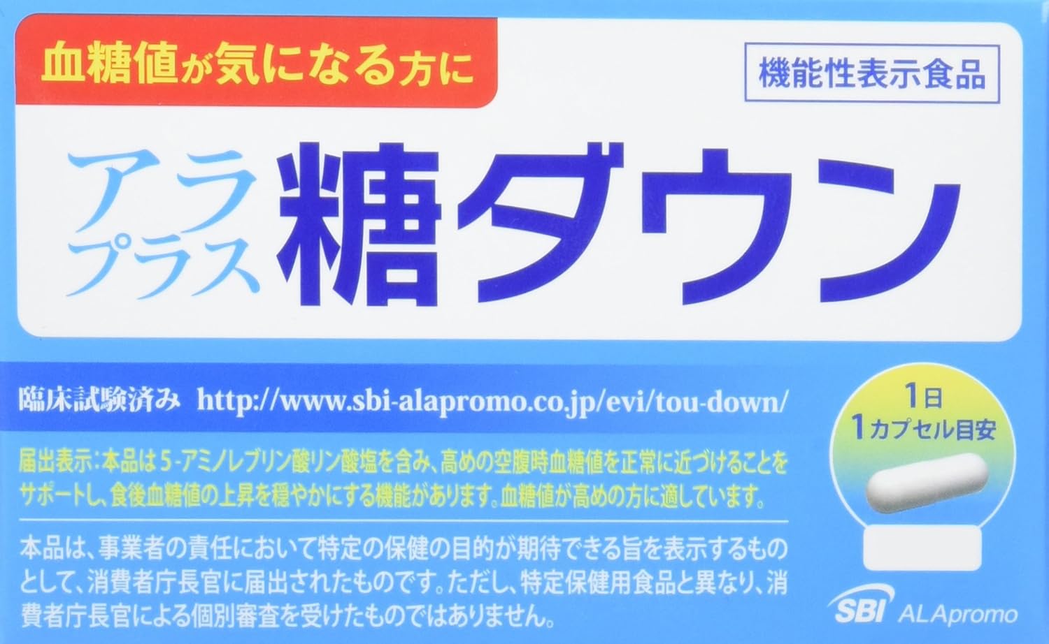 本品は5-アミノレブリン酸リン酸塩を含み、高めの空腹時血糖値を正常に近づけることをサポートし、食後血糖値の上昇を穏やかにする機能があります。血糖値が高めの方に適しています。