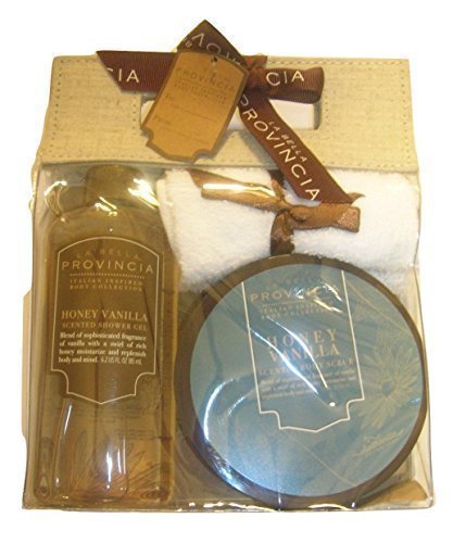 -. Binding : Misc. -. Brand : La Bella Provincia -. EAN : 0849525000924 -. Feature : La Bella Provincia Honey Vanilla Gift Set - Shower Gel, Body Scrub & Wash Cloth / 1 Honey Vanilla Shower Gel 6.2 fl. oz. / 1 Honey Vanilla Body Scrub 5 fl. oz. / and 1 wash cloth. -. IsAdultProduct : 0 -. Label : La Bella Provincia -. Manufacturer : La Bella Provincia -. MPN : B015FJAW1M -. PackageQuantity : 1 -. PartNumber : B015FJAW1M -. ProductGroup : Beauty -. ProductTypeName : BEAUTY -. Publisher : La Bella Provincia -. Studio : La Bella Provincia -. Title : La Bella Provincia Honey Vanilla Gift Set - Shower Gel, Body Scrub & Wash Towel -. UPC : 849525000924