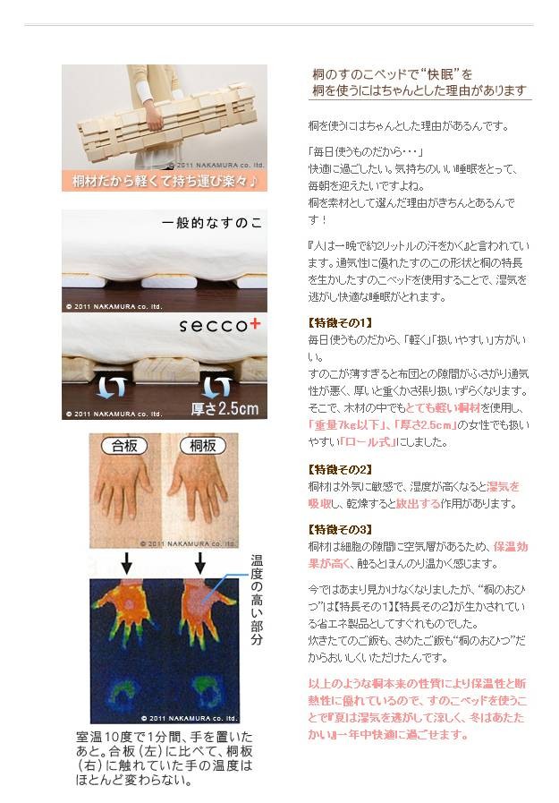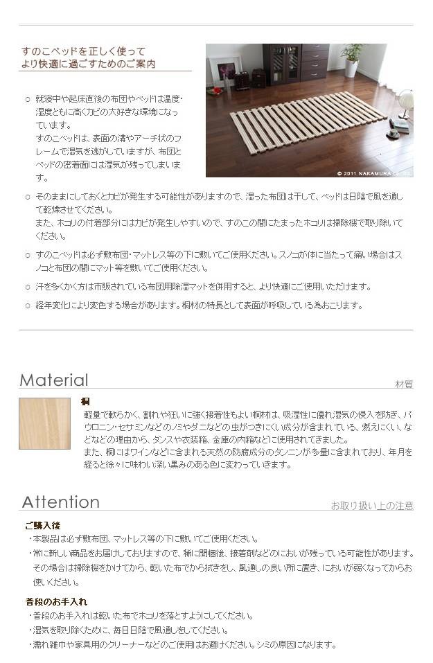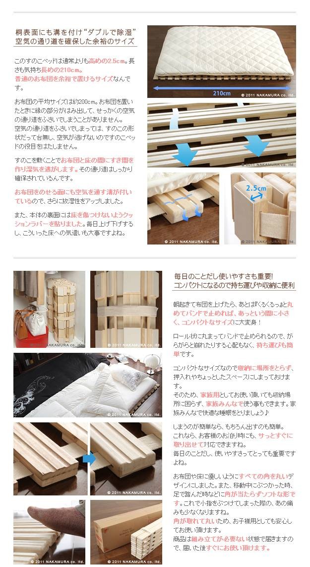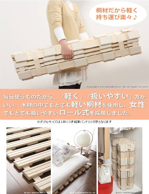 商品について:調湿性を生かした桐すのこベッド。寝苦しい時期“快眠”には欠かせません!布団と床の間に置くと隙間を作り湿気を逃がします。夏は熱を逃がして涼しく、冬は床下の冷気をさえぎります。くるくると丸めて手間いらず♪裏面にはクッションラバー付。