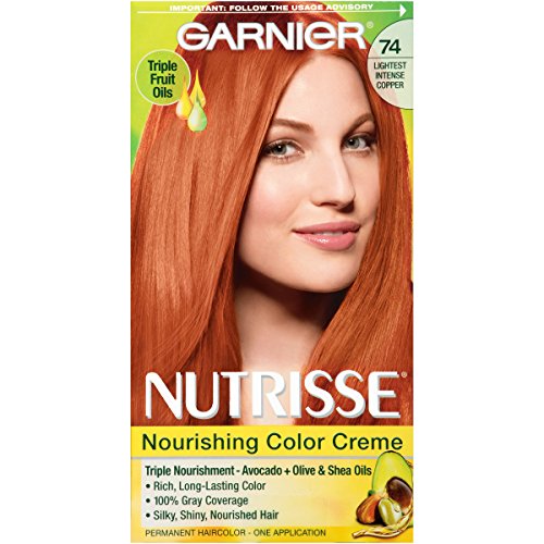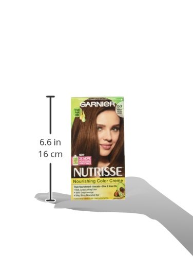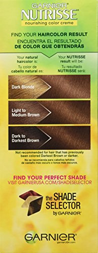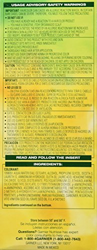 Garnier Nutrisse is the only permanent hair color creme that nourishes while you color with avocado, olive, and shea oils. The nourishing color creme enriched with fruit oil concentrate, penetrates deep into hair fibers to nourish and condition your hair so it takes color better and holds it longer, root-to-tip. Garnier Nutrisse delivers rich, radiant, long-lasting hair color with 100% grey coverage. • Permanent, nourishing hair color creme with three fruit oils- avocado, olive, and shea • The only hair color creme with a separate ampoule of grape seed oil to start nourishing as you color • Rich, radiant, long-lasting color with 100 percent grey coverage • Available in 45 Nourishing Shades Always read the hair color instructions insert in the box. Store between 50° and 80° F. Questions? Garnier Nutrisse has expert color consultants to help you. Call: 1-800-4GARNIER (1-800-442-7643). IMPORTANT: Hair color can cause an allergic reaction. Do not use if you’ve already had a reaction to a hair color product or if scalp is sensitive, itchy or damaged. Tattoos may increase risk of an allergic reaction. Do skin allergy test 48 hours before each use of this product. Don’t use over compound henna or progressive color. Wait at least 14 days after bleach, relaxing or perm before use. Don’t use on children. This is a safety summary. Read all labeling and instructions completely.Feature