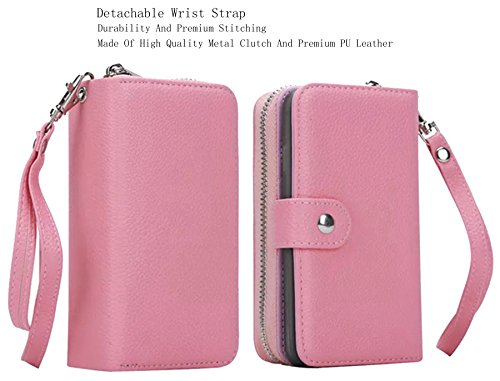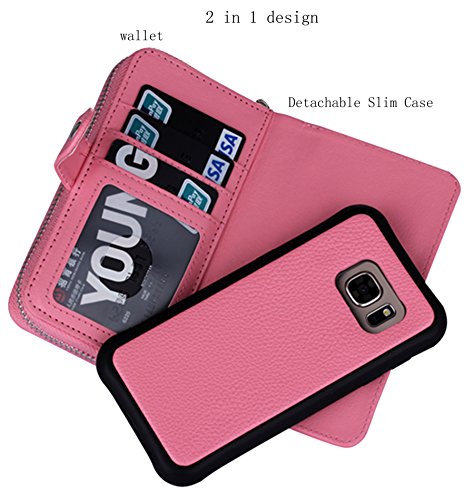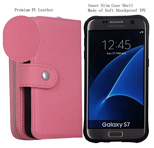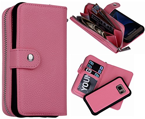 S7 Wallet Case, Magnetic Detachable S7 Wallet Purse Hynice Samsung Galaxy S7 Leather Folio Flip Slim Case With Zipper Credit Card Slots, Card Holder, Wrist Strap Wallet For Women Men(Lichi-Pink)