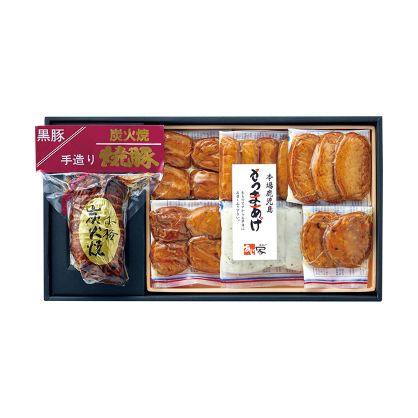●新鮮な魚肉を主原料に、昔ながらの製法で味付けし丁寧に揚げたさつま揚げと、黒豚を味噌仕立てのタレに漬け込みじっくりと焼きあげた焼豚のセットです。