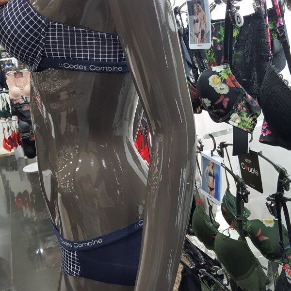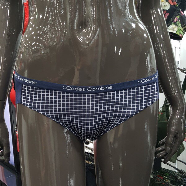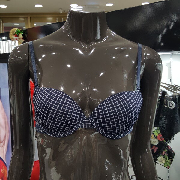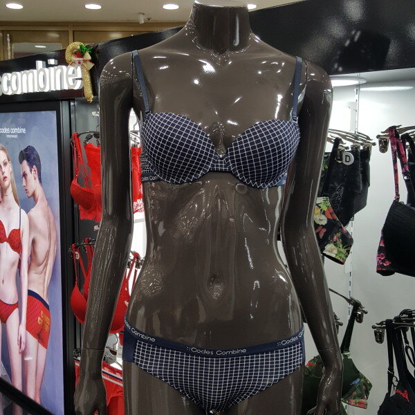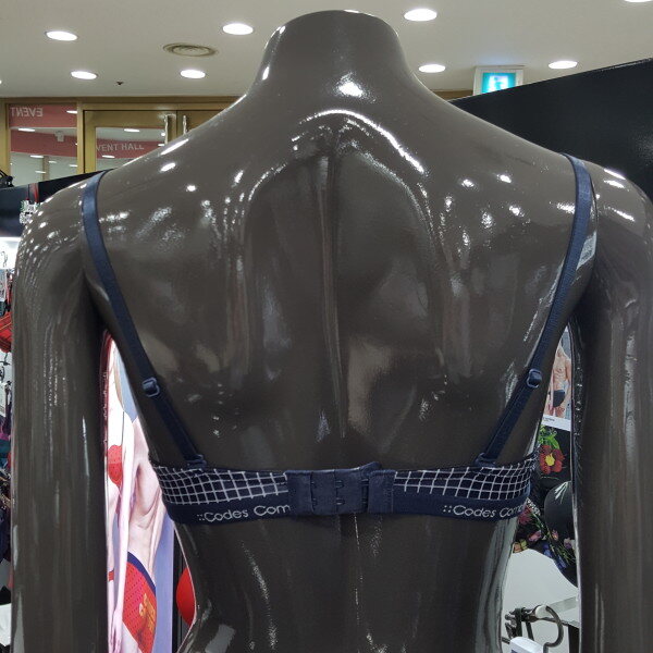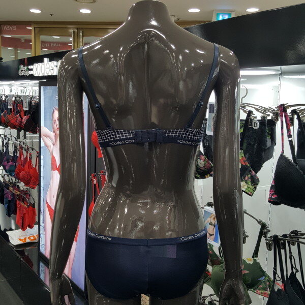 네이비 바탕에 체크 패턴으로 디자인된 코데즈 브라 팬티세트 입니다. 팬티 뒷면은 햄라인으로 바지나 원피스 착용시 힙선을 매끈하게 잡아주는 제품 입니다.