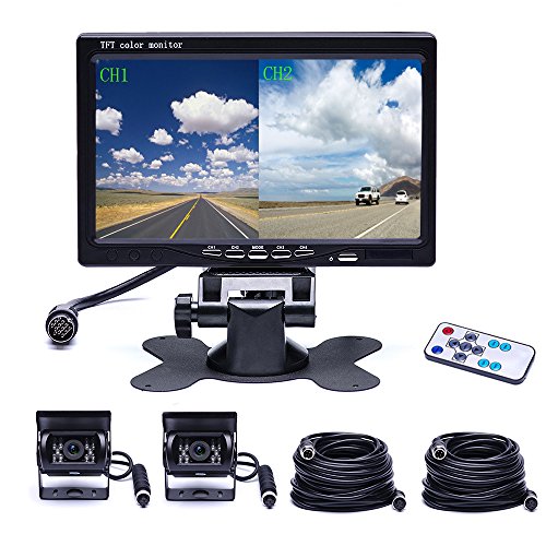 Package: 1* 7 inch Split Monitor; 2* Backup Camera(Aviation 4 Pins); 2* 33ft cable, 1* Remote Control. Support 12 months Replacement Warranty start from purchased date.