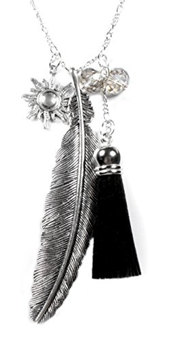 Feather and Sun Beaded Silvertone Charm Necklace with Black Tassel Accent