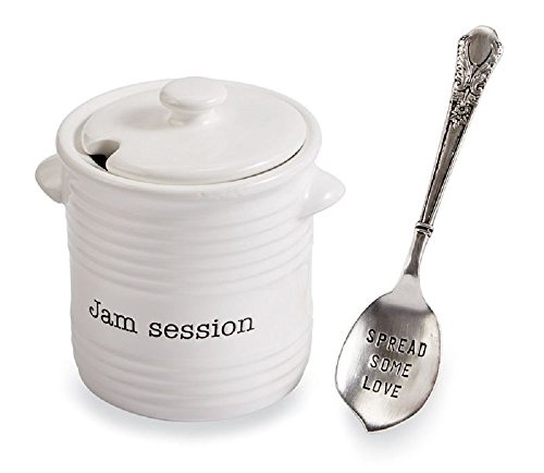 3-piece set. Ceramic jam jar features debossed "Jam session" sentiment, ribbed exterior, dimensional handles and removable lid. Arrives tied with vintage-style stamped silverplate "SPREAD SOME LOVE" spoon. Size: jar with lid 4 1/2" x 3 1/2" dia | spoon 6"