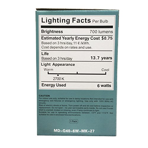 - Base: Medium Screw (E26) * Bulb Type: G40 * Watts: 60,Luminous:700lm.Voltage:120V。