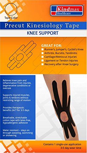 -. Binding : Misc. -. Brand : Kindmax -. Feature : 5 easy-to-apply kinesiology tape supports for relief of pain and swelling plus enhanced recovery from exercise and overuse / Provides support for injured muscles and joints without restricting range of motion / Lightweight elastic cotton tape with a latex-free, hypoallergenic, acrylic adhesive / When properly applied, stays on 3-5 days through showering, swimming and intense exercise / Illustrated step-by-step instructions in every package -. Label : Kindmax -. Manufacturer : Kindmax -. ProductGroup : Sports -. ProductTypeName : SPORTING_GOODS -. Publisher : Kindmax -. Studio : Kindmax -. Title : 5 Pack - Kindmax Kinesiology Tape Knee Support - K Tape for Knee Pain