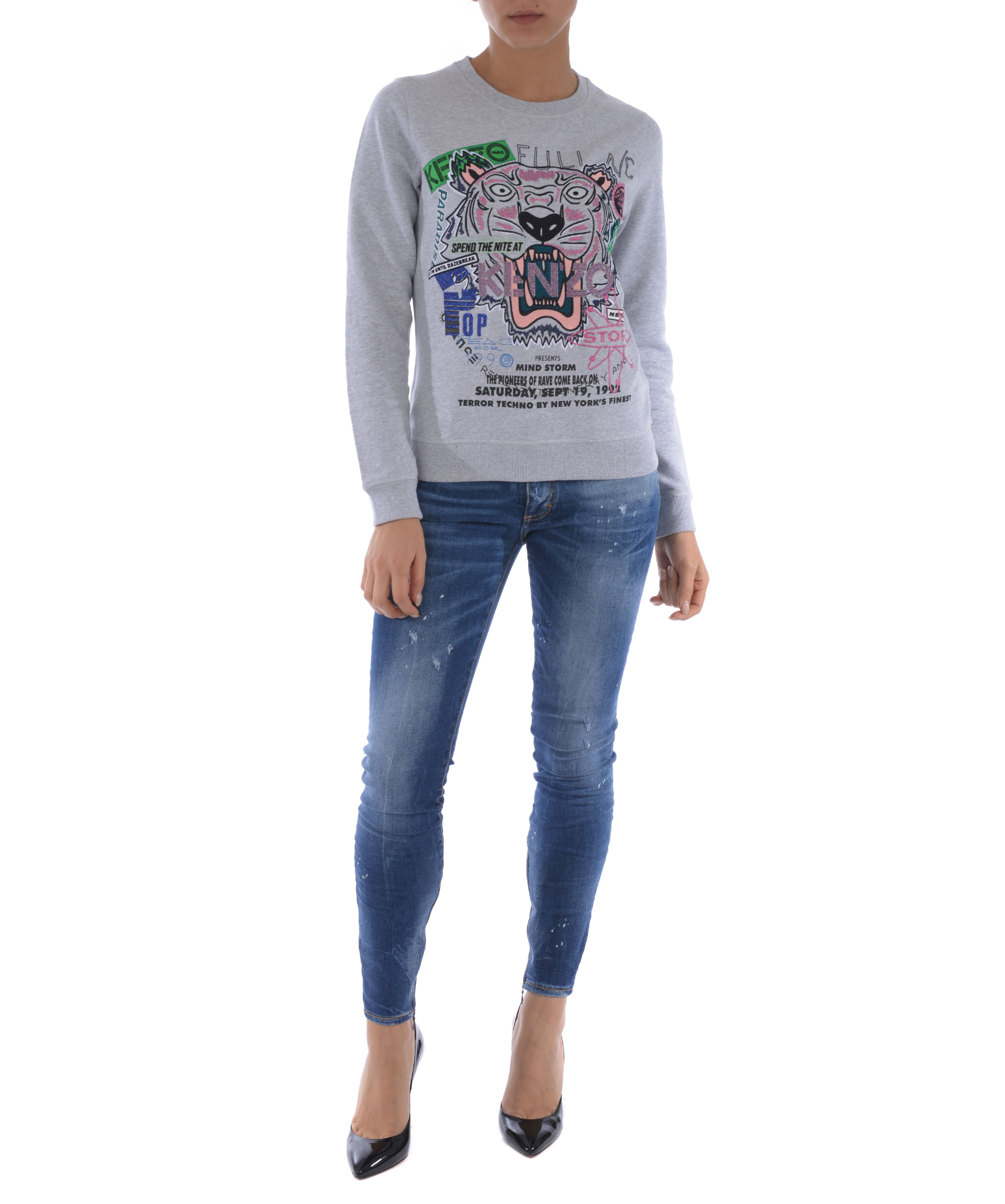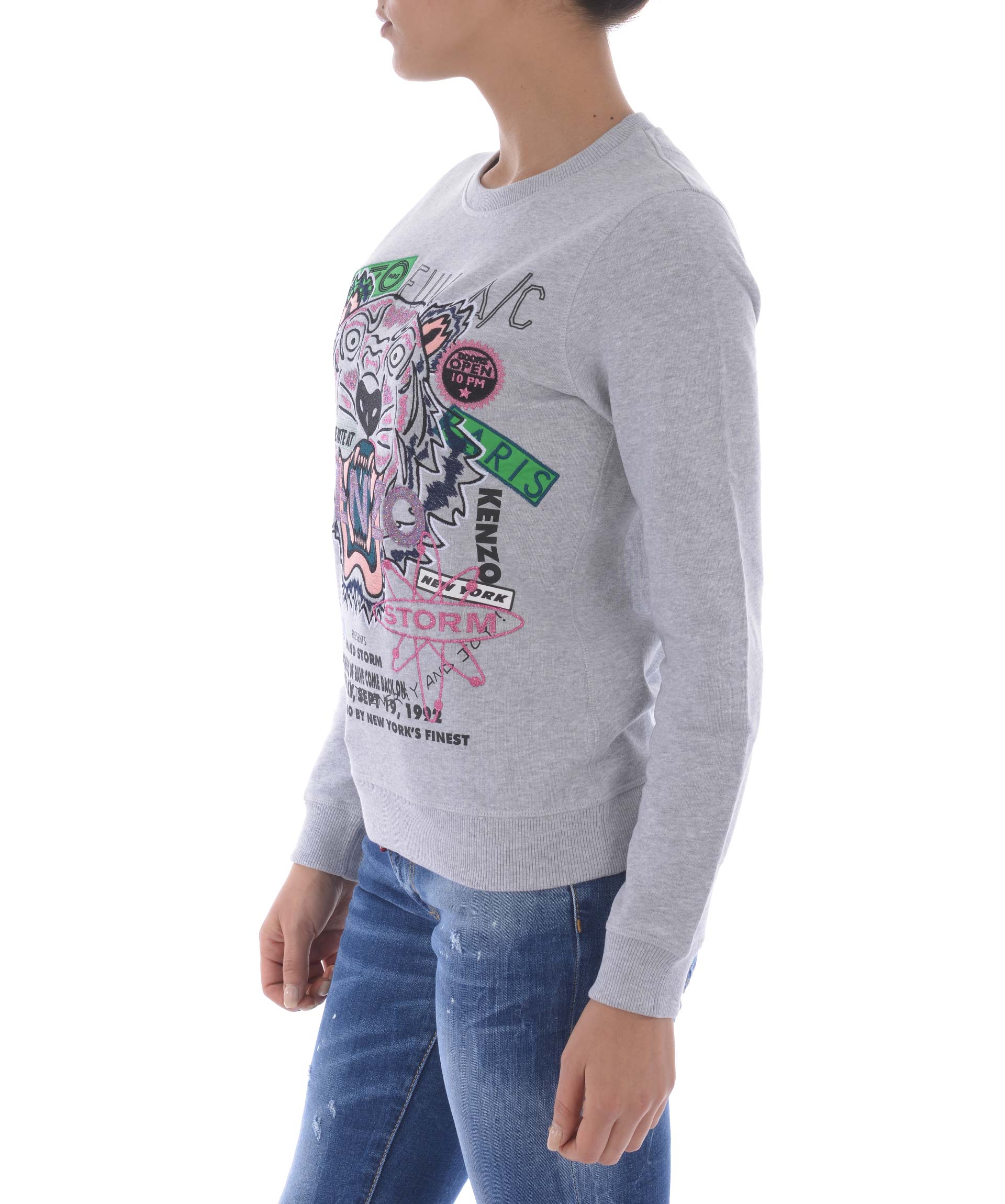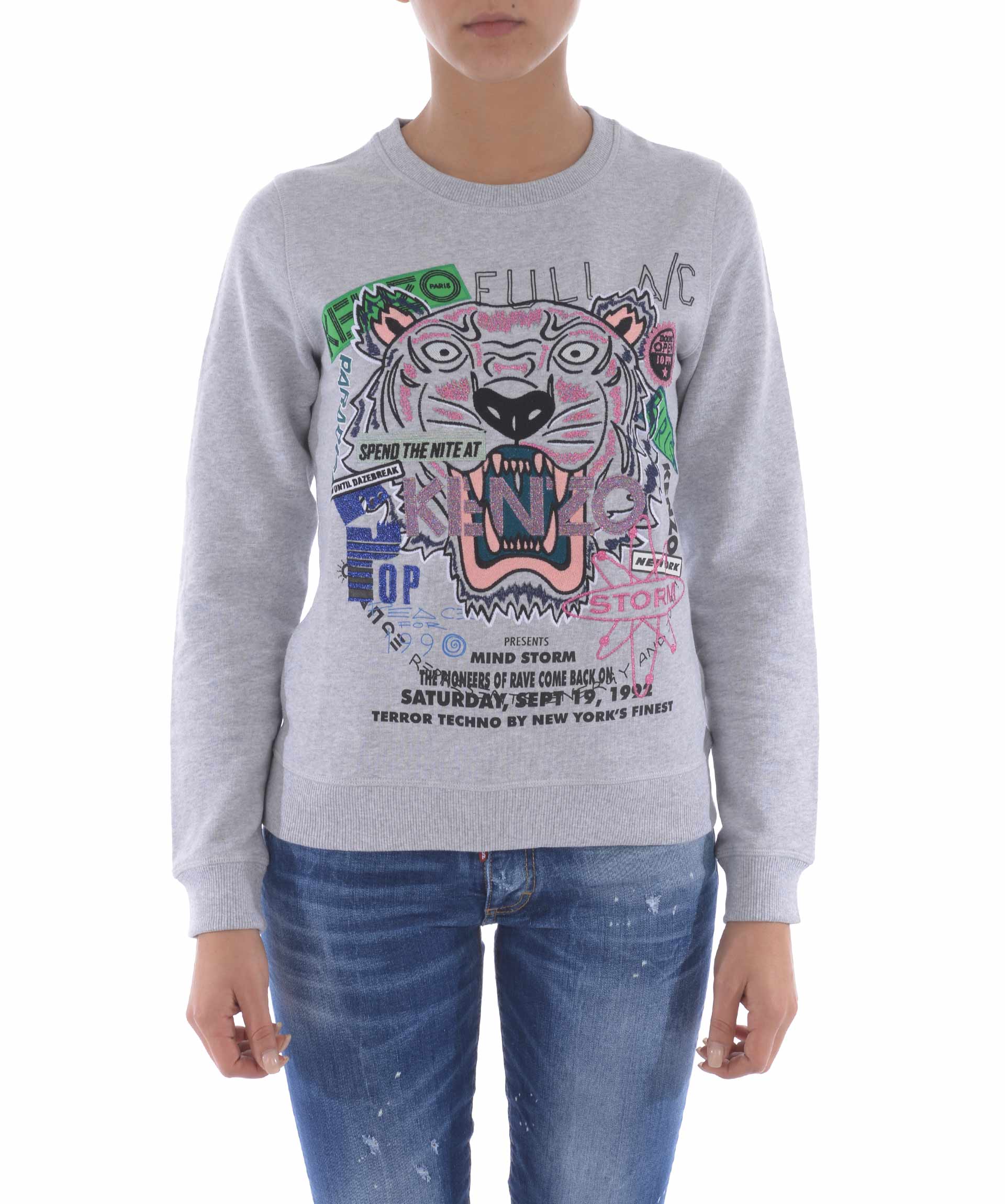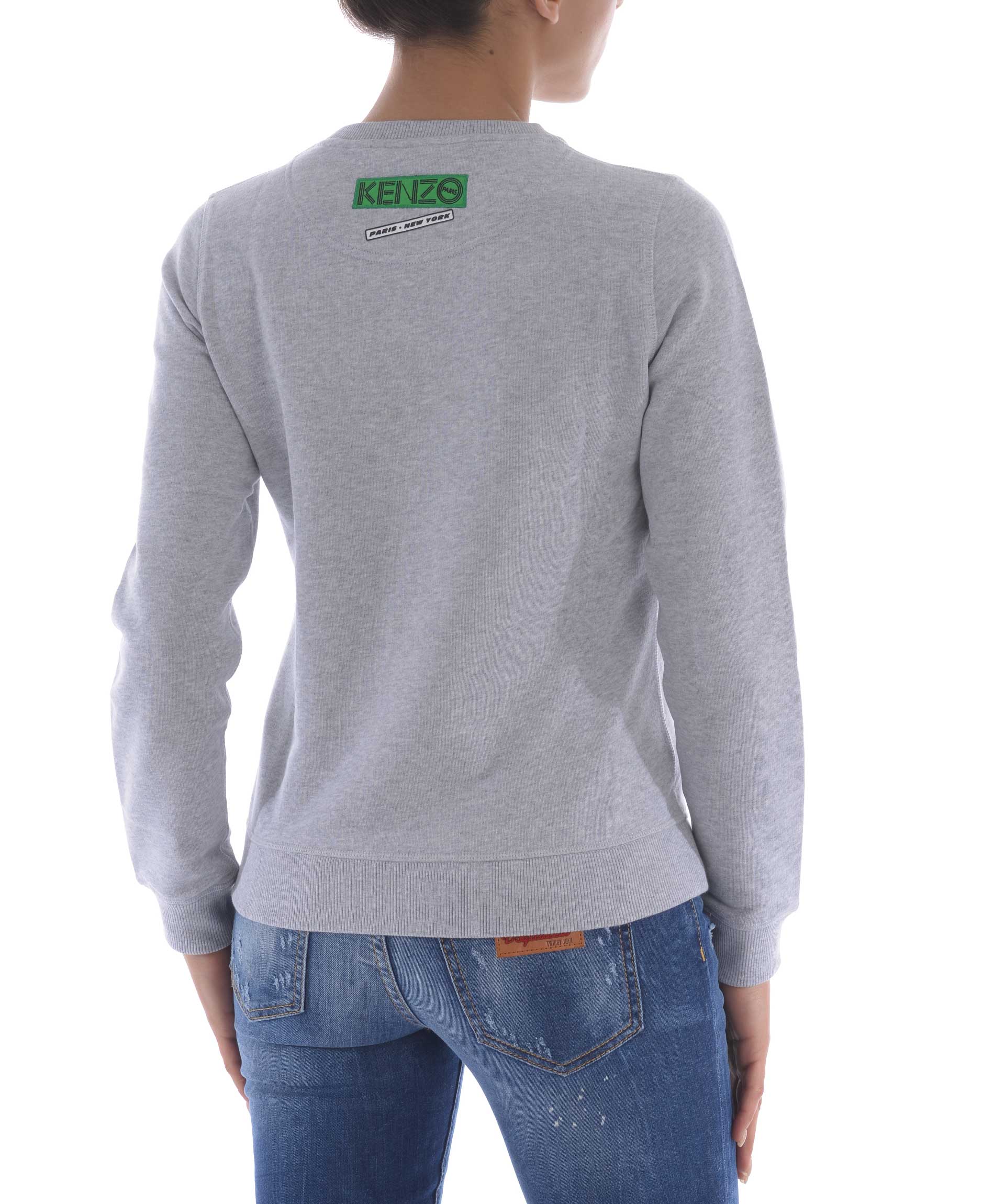 Felpa Kenzo in cotone Grigio melange. Maxi ricamo frontale con inserti in lurex. Girocollo a costine. Manica lunga. Polsi e fondo a costine. Patch logo sul retro. Misura in foto S 100% cotone