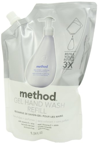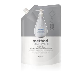 Get more - and less - with Method gel hand wash refills. The non-toxic formula, made with naturally derived ingredients, leaves hands soft and clean, and the biodegradable formula doesn’t contain parabens, phthalates, triclosan, or EDTA. Plus, it’s packaged in an easy-to-use soft pouch with a grip handle and easy-pour spout, designed to fill Method’s 12-ounce pump bottle nearly three times.