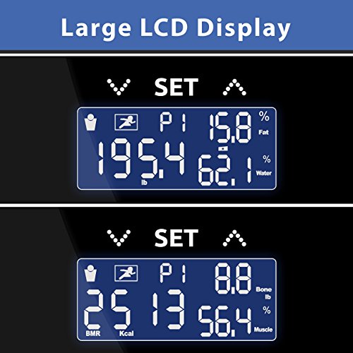 -. Feature : MEET YOUR FITNESS GOALS FASTER: Monitor essential body composition values such as; body fat %, total body water, muscle mass percentage, bone mass and even basal metabolic rate (BMR) which allow you to accurately track your progress and reach your fitness goals faster. / SIMPLE & CONVENIENT: Once your user profile is setup, the INEVIFIT Body Analyzer will automatically recognize you on future uses when stepping on the 12.3"x 12.3" premium platform. Save up to 10 unique users so that you and your family can easily monitor fitness progress. / SMART FEATURES FOR SMART USERS: Body composition analysis should be hassle free, so your scale has Auto-On & Auto-Off sensing technology to save battery life. Additionally, we have Developed Advanced User profiles to provide you more accurate composition readings based on activity level. / BE PROUD OF YOUR NEW BODY SCALE: We have designed the elegant look of our body composition analyzer right here in Southern California, and have used a larger 3.6" LCD display to allow for easy reading. Thanks to our fine quality materials and upgraded sensors it can now weigh up to 400 lbs (180 kgs). / UNRIVALED CUSTOMER SERVICE: The INEVIFIT Bathroom Scale comes with 7-day real USA customer support and our products include the industry leading 5-year manufacturer's warranty. You can rest assure that you will be 100% satisfied with the INEVIFIT experience.