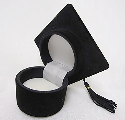 - Feature : High Quality Black Flocked Velvet Ring Box / Unique box makes an excellent keepsake! / Graduation Hat Shape Ring Box with Tassle / Comes packed in White Sleeve / Black Flocked Velvet Outside & White Velour Ring Insert