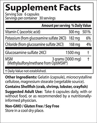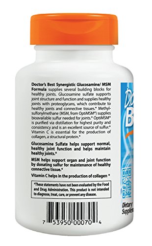 Doctor’s Best Synergistic Glucosamine/ MSM Formula supplies several building blocks for healthy joints. Glucosamine sulfate supports joint structure and function and supplies healthy joints with proteoglycans, which contribute to healthy joints and connective tissues.* Methylsulfonylmethane (MSM, from OptiMSM) supplies bioavailable sulfur needed for joints.* OptiMSM is purified via distillation for highest purity and consistency and is an excellent source of sulfur.* Vitamin C is essential for the production of collagen, a structural protein.*Feature