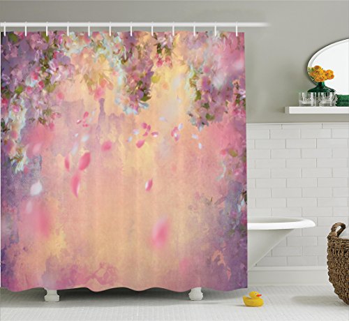 House Decor Shower Curtain Set By Ambesonne, Cherry Tree Blossom Cheerful Childish Fun Cartoon Art Garden in Sakura Season, Bathroom Accessories, 69W X 70L Inches, Pink Green Black