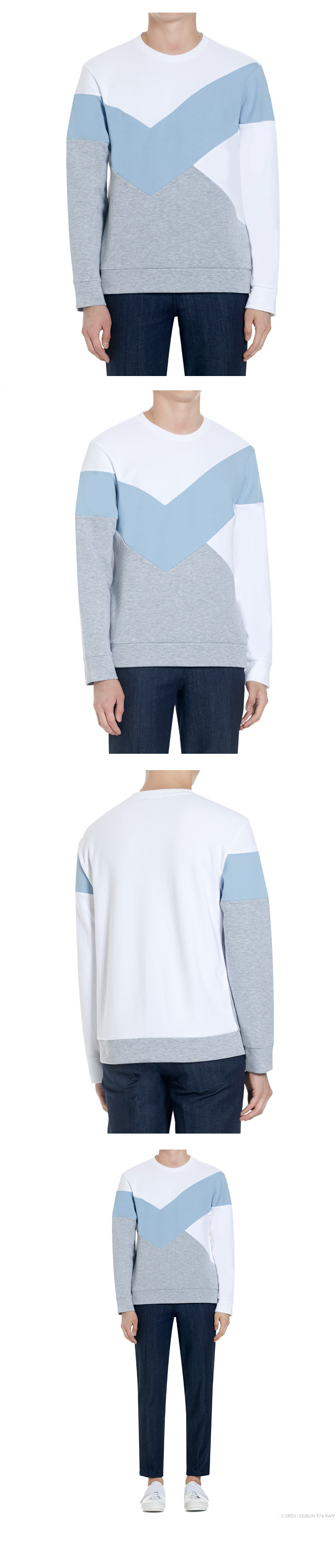 | - 기본 사이즈의 컬러블럭 스웻셔츠 - 가슴쪽에 V모양의 컬러 블럭 포인트 - 제원단 립 사용 - CP원단 사용 - MAIN.COTTON 85%, POLYESTER 15% SUB. COTTON 65%, POLYESTER 30%, SPAN 5% | |