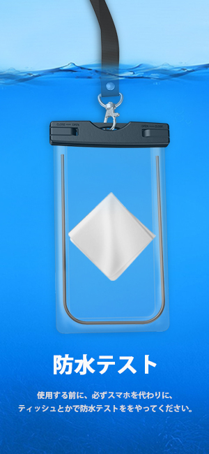 製品の使用 前に一枚の紙で30分の防水試験を行ってください。防水試験中、防水ケースは水没する必要があります。水漏れが発生する場合、弊社のサービスチームに連絡して、本体交換させていただきます。