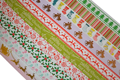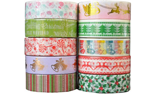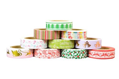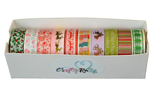 Crafty Rolls Decorative Washi Tape Set of 10 Rolls Assortment of Christmas Holiday Designs & Shapes for Scrapbooking Crafts & Gifts - Xmas
