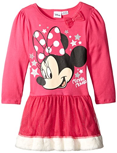Minnie jersey tutu dress with tack on glitter tulle bow and puff sleeve cap. Glitter tulle skirt with fur trim.