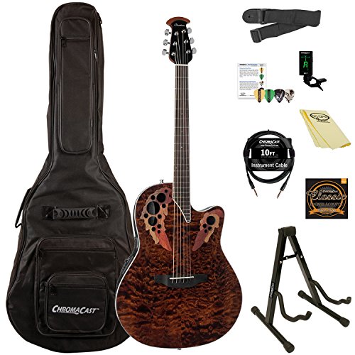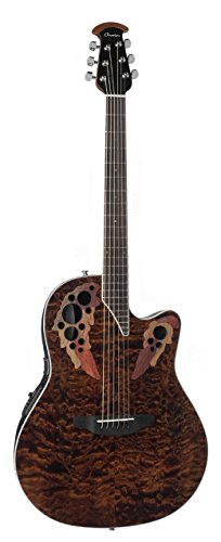 Studio : Ovation Guitars Publisher : Ovation Guitars Binding : Electronics Product Description The Celebrity Elite Plus series builds on the classic multi-sound hole instrument design of the Celebrity Elite guitars, upgrading them with select figured tops, beautiful abalone appointments and first-rate sound, design and features. The Celebrity Elite Plus CE48P-TGE guitar has the classic Super Shallow Lyrachord cutaway body with a Quilted Maple Top. This top features the Elite multi-soundhole design, which provides clear highs, focused, and balanced bass response. For the top’s quartersawn scalloped “X” bracing, we reviewed earlier Ovation bracing patterns extensively and arrived at a remarkable new design that borrows from the past and is voiced for the present. With natural tone and optimal response and power, the body, top and sound holes create the classic Ovation Elite sound, resonating with full projection, remarkable note clarity and balance, and nuanced tonal complexity. The top is complete with white binding and a beautiful transparent Tiger Eye finish. Other premium features include an effortlessly playable satin-finish neck, 10”-radius rosewood fret board with 20 fully accessible frets (24 frets for high E string), Pearloid inlays, and a rosewood bridge. The CE48P-TGE features an Ovation Slimline pickup and OP-4BT preamp system with three-band EQ, volume/gain control, onboard tuner and low-battery light. 0