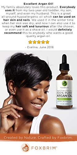 -. Feature : Fresh Argan Oil in its Premium Form - Foxbrim proudly provides you the freshest argan oil available - setting an industry standard for sourcing in extremely small batches. Unrefined, Certified Organic, Cold Pressed and Virgin Argan Oil. Never compromise when selecting the best argan oil available. / Not Oily Like the Alternatives - Unbelievably fresh, light and fast absorbing, our argan oil doesn't aggravate your skin. Other oils and synthetic products can wreak havoc on your skin and body. Foxbrim's argan oil is pure with purpose, ensuring you achieve your desired results without the typical worry. / Unrivaled Natural Moisturizer - You won't find a more complete, enriching and yet delicate moisturizer. Abundant in fatty acids, Vitamin E and antioxidants, there's simply no comparison when it comes to a nutrient-rich natural moisturizer. Foxbrim provides you this proven oil in its premium form. / So Many Uses... to name a few - For your HAIR: Leave-in conditioner. Natural shine. Stop tangles. Calm frizzy ends. Nourish and strengthen hair. For your BODY: Hydrate under-nourished skin. Diminish and eliminate stretch marks. Repair cracked heels. For your FACE: All day moisturizer for even the most sensitive of skin types. Anti-inflammatory to lessen redness and dramatically reduce redness brought on by acne and other skin ailments. Pre-shave oil. Natural lip moisturizer. For your HANDS: End dryness, cracking and peeling. Complete cuticle repair. / Amazing Manufacturer Guarantee - We stand behind our premium oils with an amazing guarantee. If you don't find this to be the absolute best argan oil you've experienced let us know for a full refund. No questions asked.