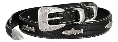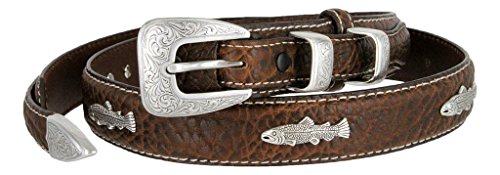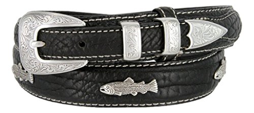 Binding : Apparel Product Description Bold, Rugged, and as tough as they come. This Thick Bison leather belt is given a bold heavy duty white stitching for a handsome look and to feature the un-corrected Natural Bison Leather. This Ranger style is 1-1/8"(29mm) wide with 3/4" billets sewn at each end. 3/4" Silver-finish Buckle Set. Comes with 5 Fish conchos. Sizing: Measure around where you wear the belt, with your pants on, and order that size. 0