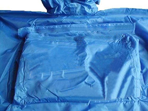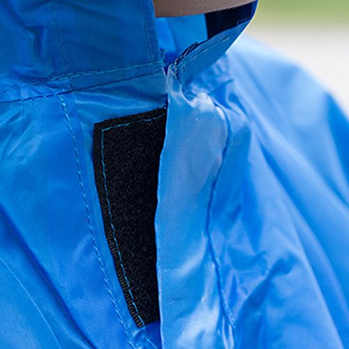 -. Feature : 210T Polyester Taffeta, waterproof, ultralight and environmental protection. Non-toxic. / Large volume of backpack cover, and can be pack up by velcro when not use. Protects you and your backpack from heavy wind and rain. / Velcro design on neckline, solve the problem of head opening too small for some people. / Adult Sized; Dimensions: 90.55" x 55.11" (Front 43.3", Behind 47.24"). It can be used as raincoat/poncho, dampproof mat, tarp and sunshade with grommet corners. / Super lightweight, comes with a same color storage bag, easy to carry and use at only 9.8 ounces.
