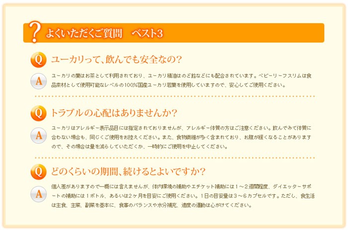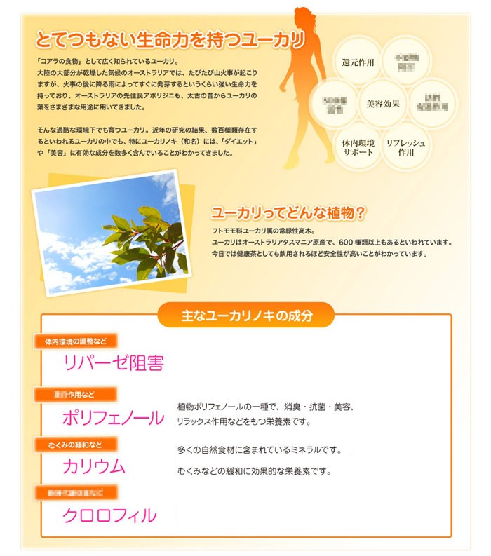 | 原材料 | ユーカリ葉殺菌粉砕品、デキストリン、HPMC、グリセリン脂肪酸エステル、リン酸三カルシウム、微粒酸化ケイ素、着色料(ベニバナ黄、クチナシ青) |