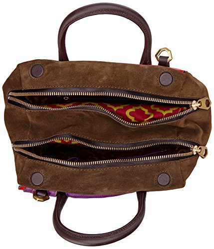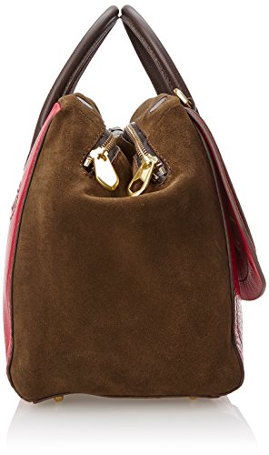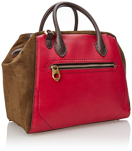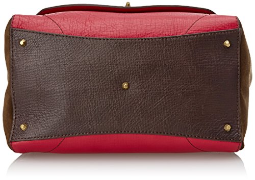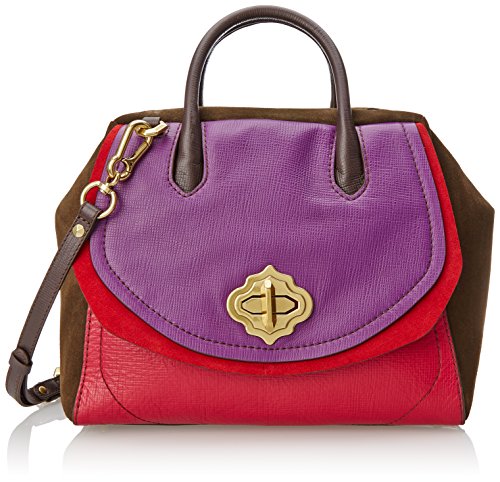 Color-block handbag featuring dual zippered top and front flap with decorative turn-lock hardware