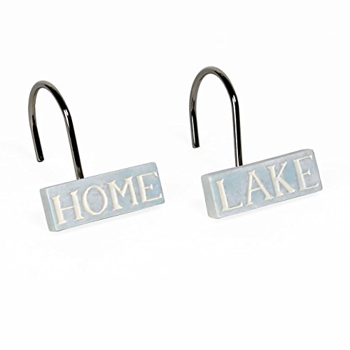 - The Lake Retreat coordinating shower hooks have the words Home and Lake on them.