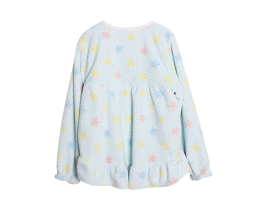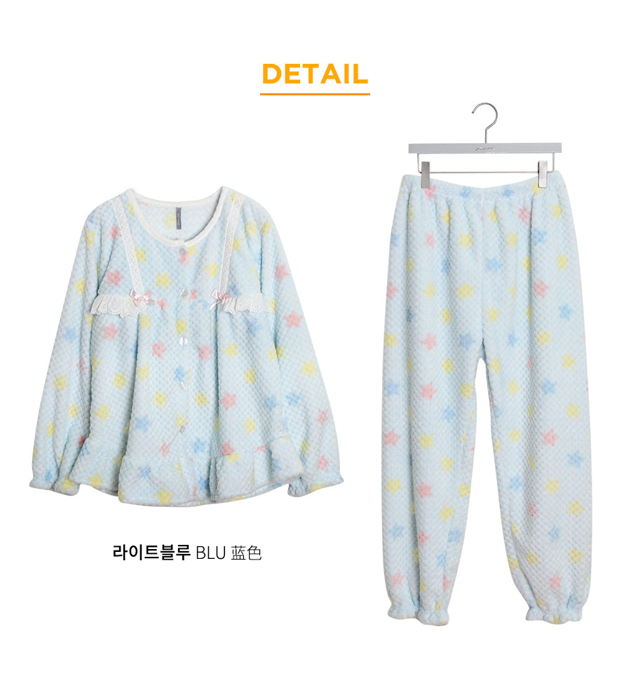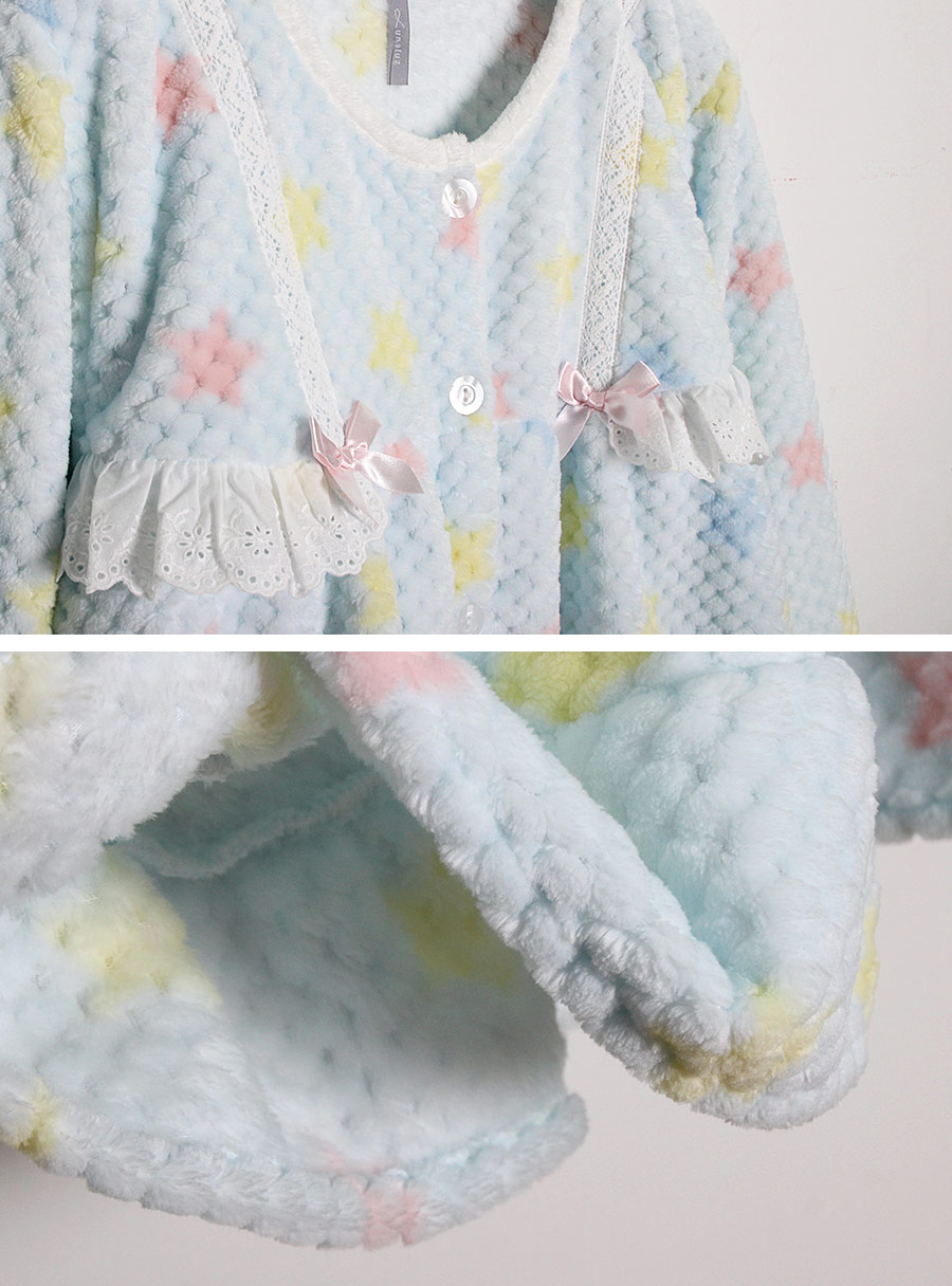 두툼한 양면 밍크 극세사 원단으로 보온성UP~! ★밍크 극세사 원단으로 매끈하고 피부에 닿는 느낌이 좋아요 : ) 와플 짜임으로 원단 자체가 포인트가 되어주며, 양면 극세사 원단으로 두툼하여 보온에 좋고, 부피감이 있는 밍크 잠옷입니다 :> 양면으로 촘촘하게 박힌 얇은 털들로 보온성은 높여주었고, 퀄리티 좋은 원단을 사용하여 털빠짐을 줄여주었습니다. 터칭감이 굉장히 좋아 분명 만족 하실 거에요.^^ 보온성이 굉장히 좋아 추운 겨울, 얇은 이불만 덮으셔도 숙면을 취하기 좋습니다. 퀄리티 좋은 원단으로 제작하여 털빠짐이 현저히 적으며 관리하시기 좋습니다. -극세사 원단의 특성상, 처음에 컷팅된 털들이 나오기 때문에 탈탈 털어서 물 세탁 하시기 바랍니다. 와플 조직감 위에 아기자기 러블리한 별 프린팅으로 포인트를 준 겨울 잠옷이에요. 러블리한 라이트핑크 컬러, 깔끔하고 화사한 느낌의 아이보리컬러에 라이트블루컬러가 추가적으로 제작됐어요. 파스텔 톤의 별 프린팅이 귀엽고 사랑스러운 느낌을 더해줍니다. DETAIL라운드 네크라인과 전체 여밈 디자인으로 입고 벗기 쉽도록 제작하였습니다. 어깨에서 바스트로 내려오는 부분까지 레이스 장식으로 귀엽게 포인트를 주고 양 쪽에 리본으로 귀엽게 마무리 하였습니다. 버튼은 살짝 큰 아이보리 컬러로 초이스 하여 분위기에 걸맞게 달아주었습니다. 소매와 발목에 밴딩을 넣어주어 활동성을 높여주었습니다. 전체적으로 young해보이면서 발랄한 분위기를 연출해주는 잠옷으로 퀄리티 있고, 사랑스러운 느낌까지 가지고 있어 추천해드리고 싶습니다. 두툼한 원단인 만큼 까다로운 봉제가 들어간 수면잠옷으로 적극 추천해드리고 싶습니다. SIZE평균 44반~66반 size까지 커버 가능한 free사이즈입니다:)