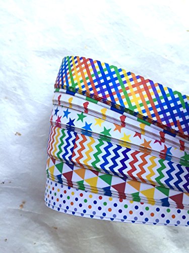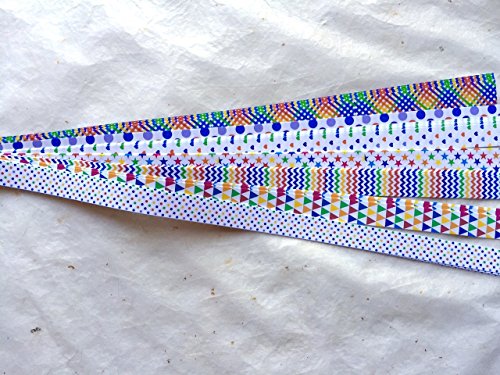 -. Feature : 50 strips of paper: assorted rainbow patterns / double sided; smooth P.R.Int finish / 3/8 1/2 5/8 inch are 19 inches long / 3/4 are 23 inches long; 1 inch are 26 inches long