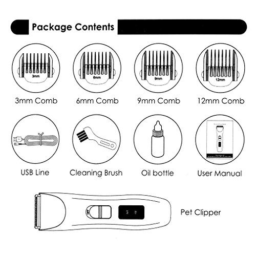 - WHAT YOU GET: 4x Adjustment Comb (3mm,6mm,9mm,12mm),1x Pet Grooming Clipper, 1x Cleaning Brush, 1x Oil Bottle, 1x USB Cable, 1x User manual, LIFE-TIME WARRANTY