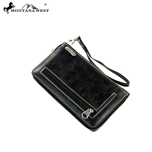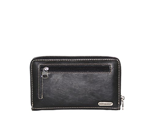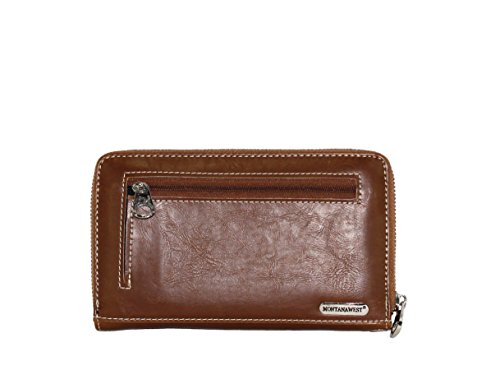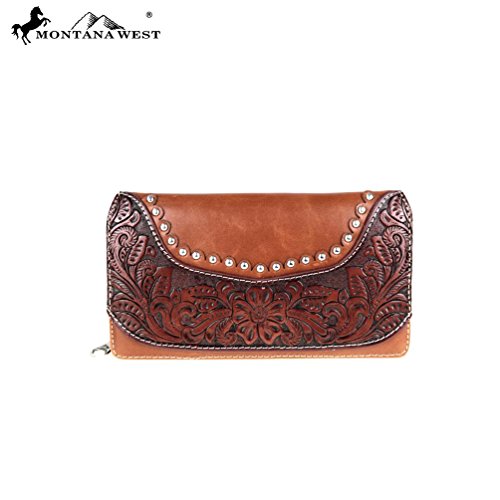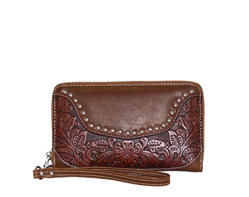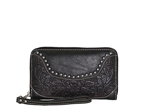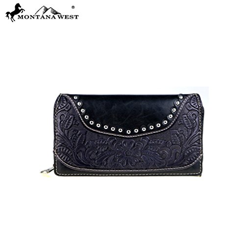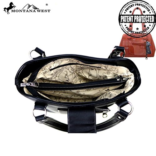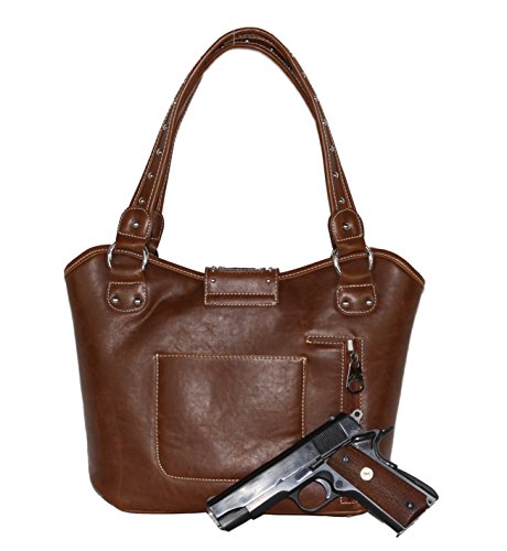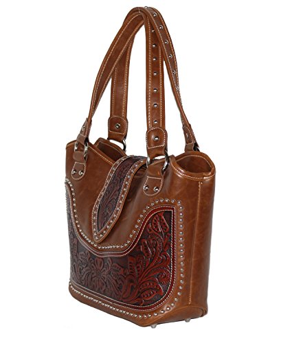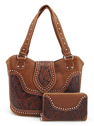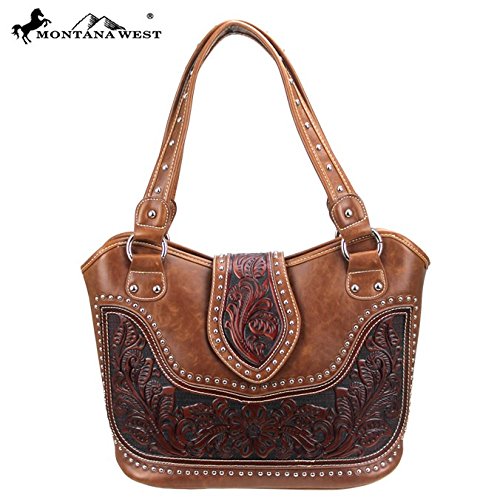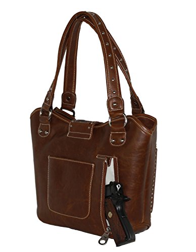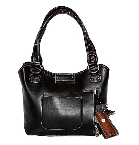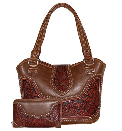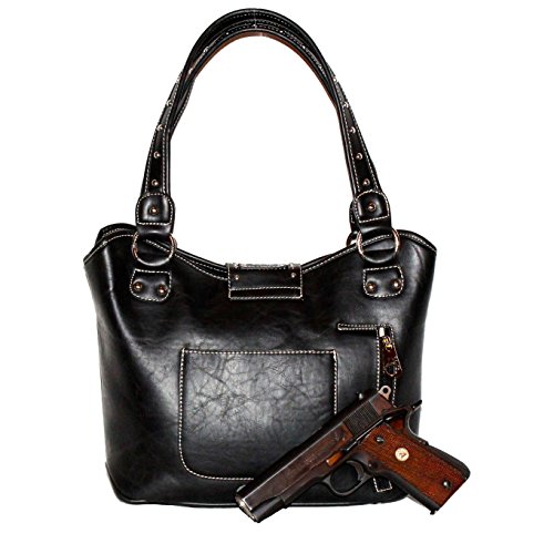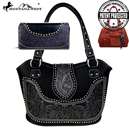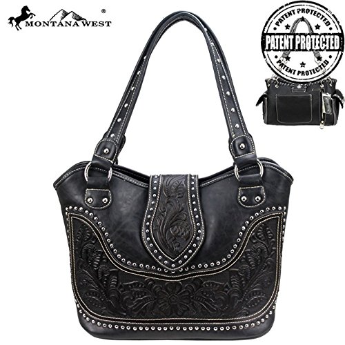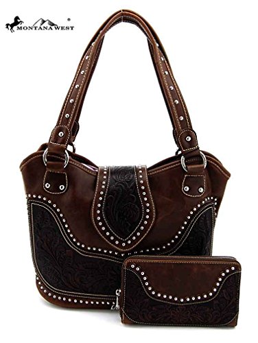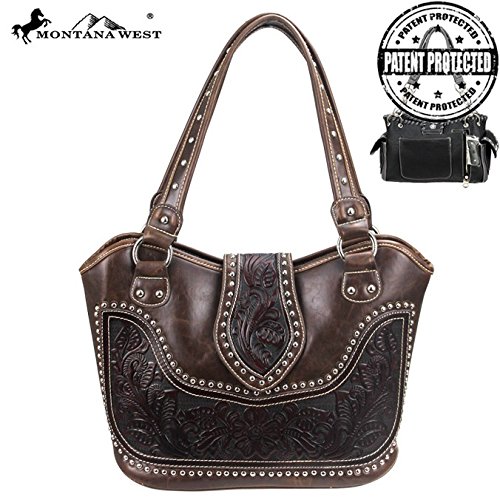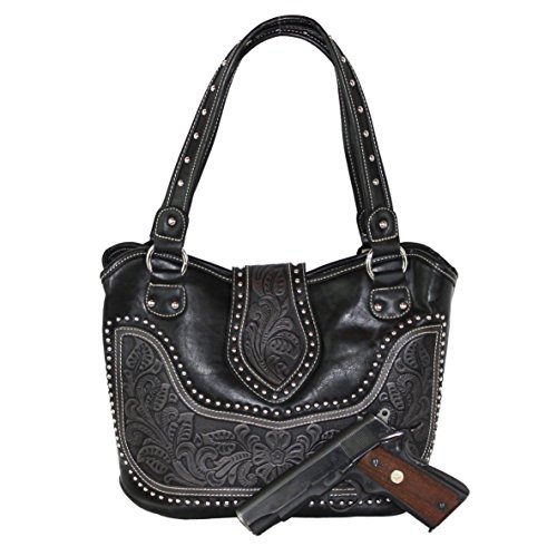Product Description Product Summary: You don't need to sacrifice style for safety. This rich, genuine leather and PU leather Montana West shoulder purse and matching wallet is a must for all women who want the best of both worlds. Protect yourself from the dangers out in this world. Keep your gun stored discreetly, yet accessible at all times in the concealment compartment of this lovely bag. You will love the beautiful floral tooled genuine leather design on the front and flap of this purse that snaps close. Detailing silver embellishments decorate the front on the bag. The spacious main zippered compartment is divided into two parts by a full length zippered pocket. The interior features a smaller zippered pocket on one side and 2 open pockets on the other. An additional open pocket is found on the back for cell phone use and double handles with a 10 inch drop finished off this rich, classy bag. Available in 3 colors: Black, Brown and Red.The matching stylish wallet by Montana West has the same floral tooled leather and detailing silver studs embellishment. The interior has 8 slots for ID and credit cards, 5 open pockets for bills and other necessities, and a zippered pocket for your coins. A single zipper encloses the entire wallet and a removable strap converts the wallet into a wristlet when desired. Concealment Pocket Specifications: The separate concealed carry compartment is located on the back and has a right vertical access. It measures 9.5" wide x 5" and easily stores all small to medium size framed handguns. Purse Dimensions: 14.5" x 4" x 10.5" (10" drop straps) Wallet Dimensions: 7.5" x 4.5" 0