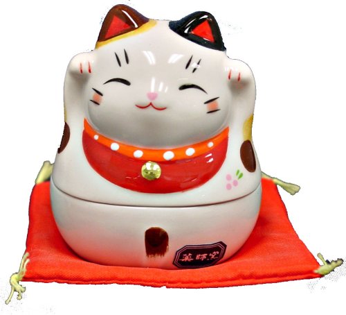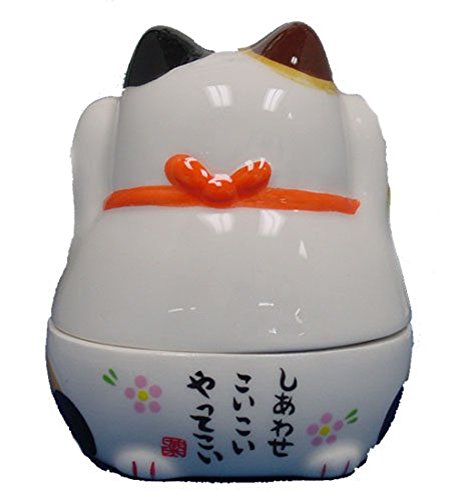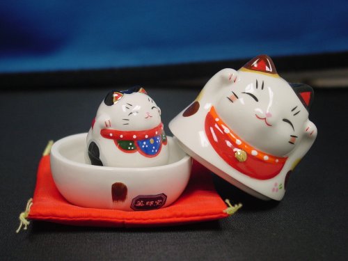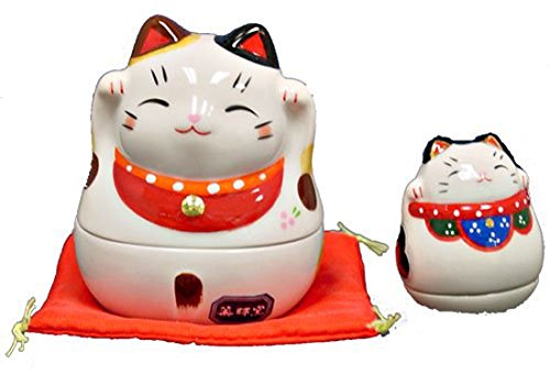 -. Brand : yakushigama -. Color : white -. EAN : 4973430001816 -. Feature : Japanese Happy cat - White- brings Happiness / Both hands are up / Right hand up means - brings Money/Rortune / Left hand up means - brings people/customers (for business) / 2pcs in an original box. -. Label : Yakushigama -. Manufacturer : Yakushigama -. ProductGroup : Kitchen -. ProductTypeName : KITCHEN -. Publisher : Yakushigama -. Studio : Yakushigama -. Title : Maneki Neko - Japanese Lucky Cat with Roly Poly mini cat (#7321)
