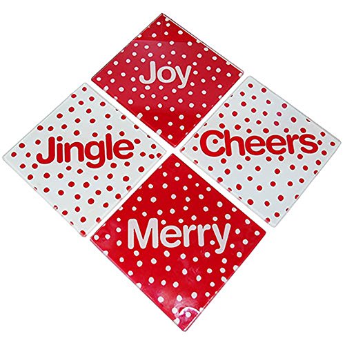 - Make your table more festive with this 4-piece Glass Holiday Coasters Set featuring glass coasters with red and white polka dot print and the words "Cheers", "Merry", "Jingle" and "Joy"
