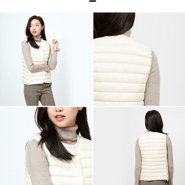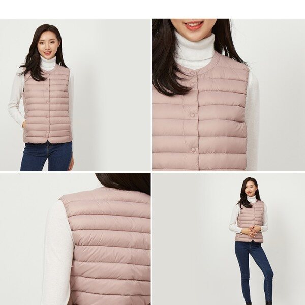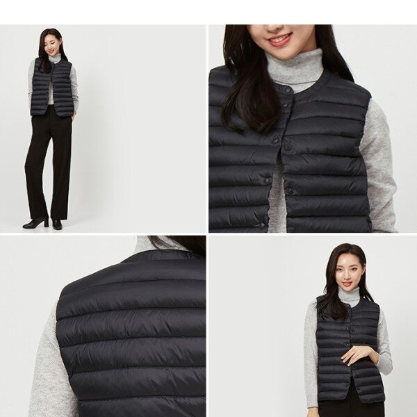 여성 크루넥 라이트 다운초경량 다운 퀼팅 베스트 입니다얇고 가벼우면서 보온성이 뛰어난 울트라 라이트 다운 사용으로 베이직하면서도 여성스러운 실루엣 입니다은은한 광택감과 소프트한 컬러감이 돋보이며, 간절기에 가벼운 니트나 셔츠에 간편하게 걸쳐 입기 좋습니다밀착력과 보온성이 우수한 다운 90,깃털 10을 사용하였습니다