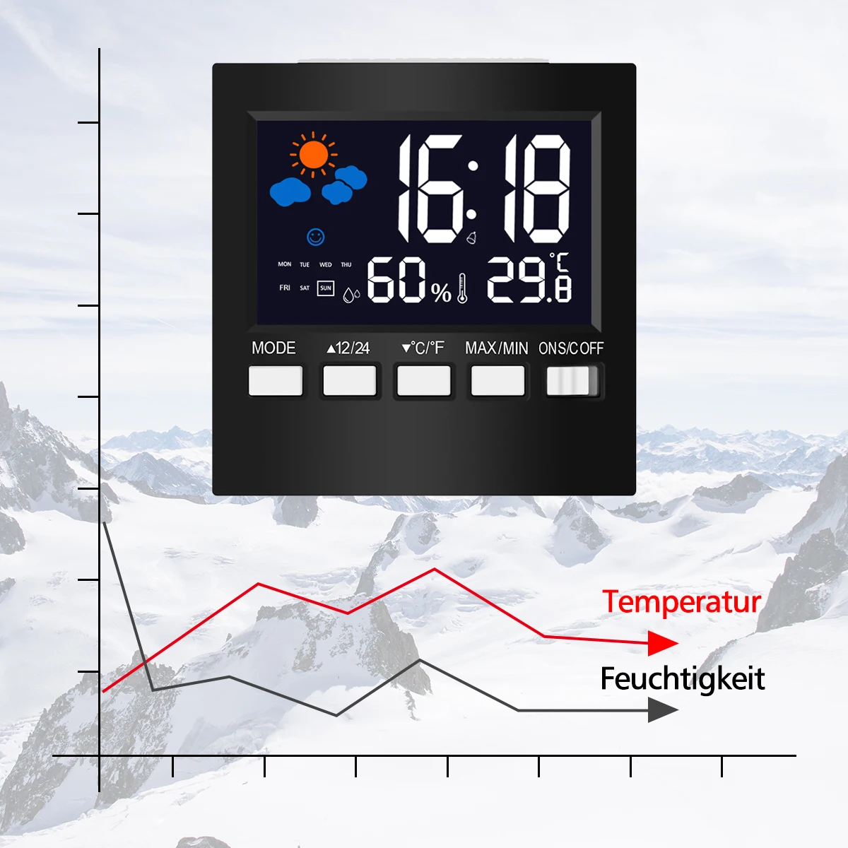 1.Time (12/24hours); date(2000 to 2099years); week; temperature(Degree Fahrenheit/Degree Celsius)