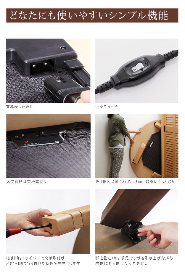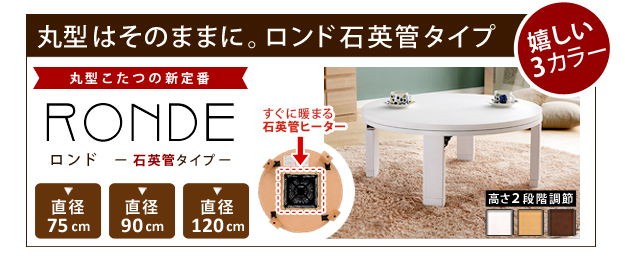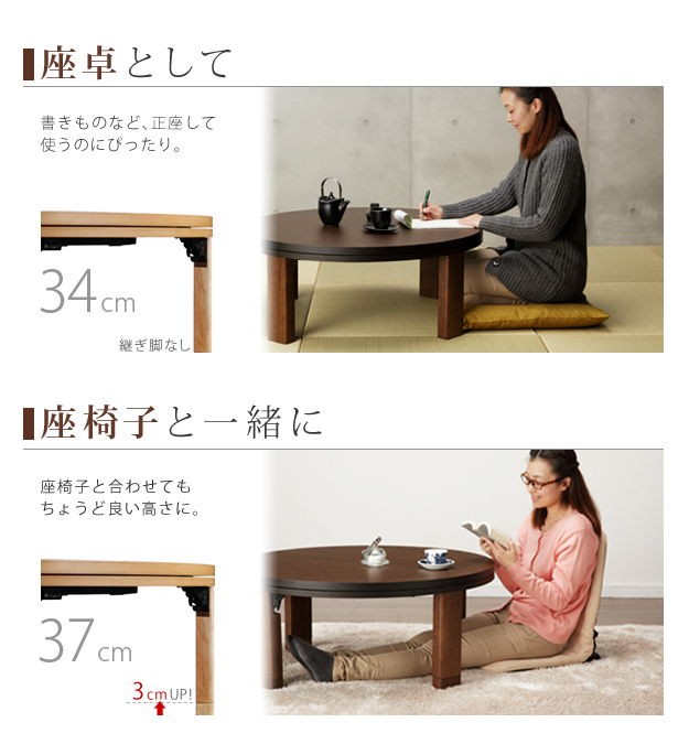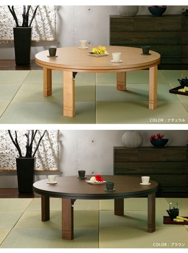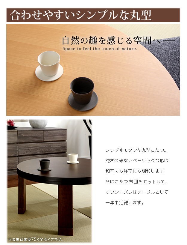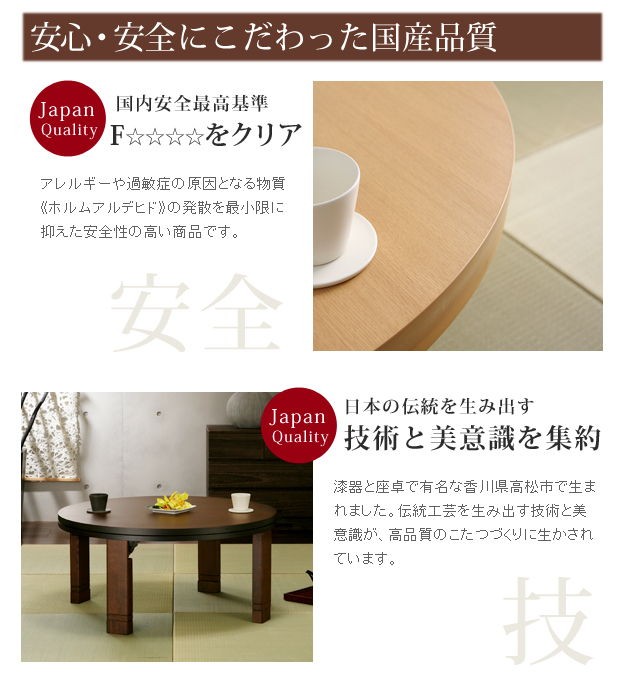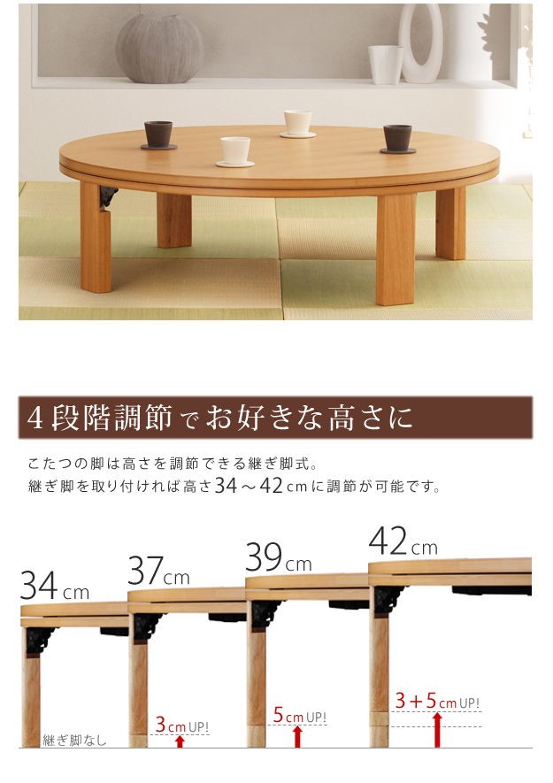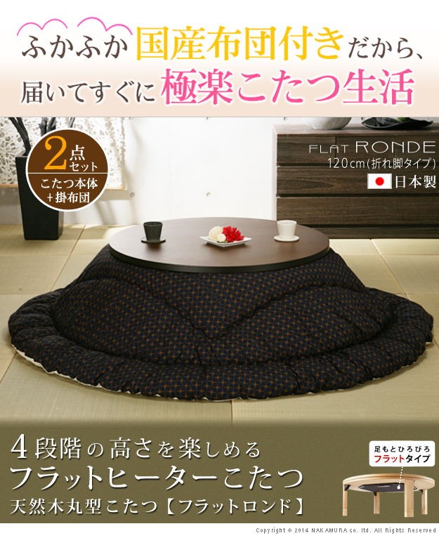 商品について:楢天然木の木目が美しい日本製の円形折れ脚こたつと色柄豊富なこたつ布団セット。フラットヒーターなので足元は広々。ムラなく隅々まで均一に暖まります。ヒーターを気にせず1年を通してお使いいただるデザインです。ローソファーや座椅子にも合わせやすい継ぎ脚付き。高さの違う2種類の継ぎ脚(5cm・3cm)が付いているので4段階に高さ調節ができます。折れ脚式ですので使わない時は折りたたんで収納できます。こたつ布団はクッションやカバーにも使われる丈夫な国産生地を使用し、国内工場で綿入れ・縫製をしました。ボリュームたっぷり!すみまでしっかり綿が入ったふっかふかのこたつ布団です。