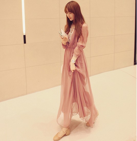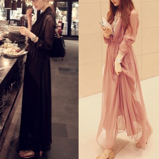 ワンピース ロング マキシ シフォン シースルー ドレープ ドレス 長袖 上品 エレガント デート お呼ばれ パーティー ブラック ピンク 大人 drgz0726