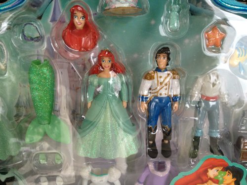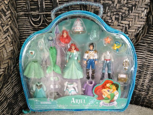 Includes: Ariel, 3 dresses with shoes, mermaid outfit, cape, fabric wedding veil, nightgown, 2 Ariel heads, Prince Eric with 2 outfits, shoes, purse, candelabra, fork (dinglehopper), starfish, cake, picture frame, necklace and treasure chest