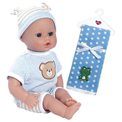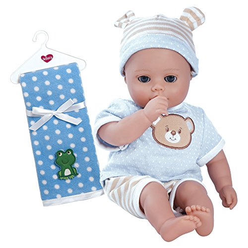 Adora PlayTime Babies are the perfect first baby doll weighing just about 12 ounces and have adorable life-like features! Beary Blue is handmade with our exclusive, lightly baby-powder scented vinyl and include a baby bottle when feeding time comes. They're the perfect toy for cuddling with their bean weighted bottoms which gives these baby dolls the feel of a real baby! When it's bedtime, PlayTime Babies can open and close their eyes and can suck their little thumb. Plus, Beary Blue comes with an ultra-soft fleece blue blankie with white polka dots and a cute froggie applique. Perfect for keeping Baby warm!Feature