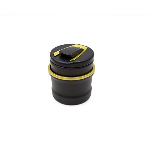-. Feature : Product Name: Car Ashtray; Material: Plastic / Package Content: 1 x Car Ashtray / Shell Color: Black, Gold Tone / Car Ashtray Size: 7.6 x 8.8cm/3 x 3.5inch(Max.D*H) / Storage Tank Size: 8.3 x 6cm/3.3 x 2.4inch(Max.D*H)